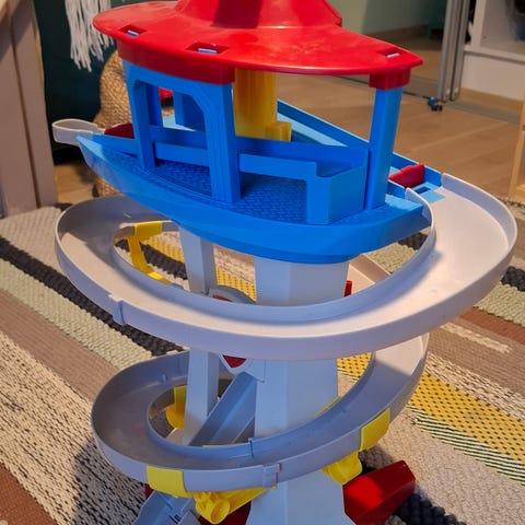 Pj Mask torni + hahmot + autot. Sivussa oleva hissi voidaan liikuttaa hahmoja ylös ja alas