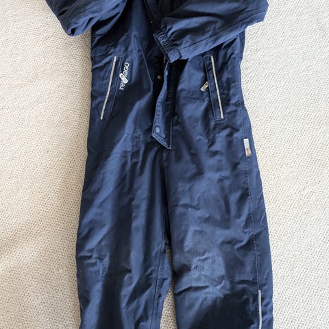 Kahtena talvena käytössä ollut, meille uutena ostettu lämmin tummanpunainen Reiman 128 cm Stavanger toppahaalari. Käytönjälkiä löytyy eniten lahkeista joista kangas on parista kohdasta rikki, kangas paikoin pehmentynyt, mutta muuten kelpo haalari vielä kakkoshaalariksi. Paras haalari ikinä, kangas on ollut todella kestävää. Polviin on ompelija ommellut mustat paikat. Jalkarenksut puuttuu, mutta renksujen napit ovat paikoillaan. Helppo laittaa uudet vaikka reikäkuminauhasta.