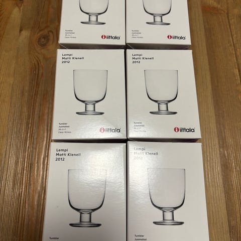 Iittala Lempi juomalasit kirkasta lasia. Monikäyttöiset juomalasit arkeen ja juhlaan, soveltuvat esimerkiksi vedelle, mehulle tai muille kylmille juomille. Muotoilu Matti Klenell 2012. Pakkaus sisältää kaksi lasia (määrä pääteltävissä kuvista). Sopivat käyttöön eri vuodenaikoina ja yhdisteltäväksi muiden Iittala-astioiden kanssa.muun parettain