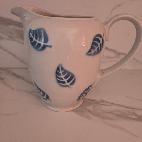 Kaarina Ahon suunnittelema KL-sarjan Arabia Arki maitokannu. Korkeus 140mm, halkaisija 100mm. Vetoisuus 1 litra.