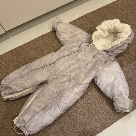 Hyväkuntoinen toppahaalari. Ainoa moite on pieni tumma viiru käsivarren kohdalla joka ei pesussa lähtenyt ja toki teddykarva vähän käytöstä lyttääntynyt, mutta edelleen pehmeä. Juuri hajusteettomassa pesussa käynyt. Hihat ja lahkeet saa umpinaiseksi käännettyä. Kokomerkintä 74, 6-9kk. Itse sanoisin että paras 6-8 kk. Olisin voinut laittaa kuvaukseksi melkein erittäin hyvä, kun tosi siisti, mutta tahran vuoksi olkoon hyvä. Väri on semmonen vaalea khaki minttu vihreä sekoitus. Tulee kuvissa ilmi hyvin.