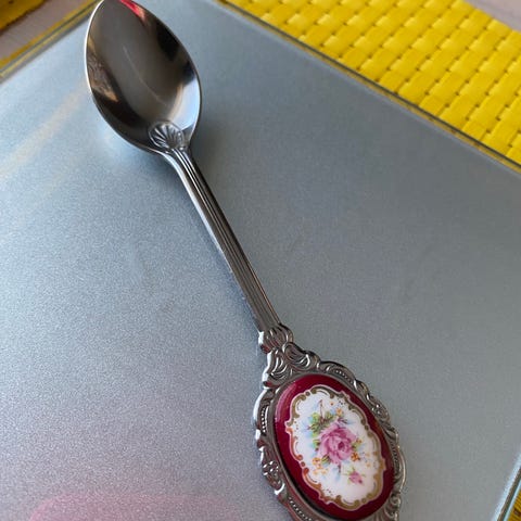 Kuvion nimi: Hildesheimer Rose. Lusikan pituus 8,8 cm.