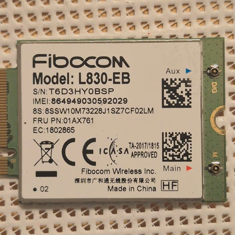 Myydään Fibocom L850-GL LTE -modeemikortti. 4G LTE. M.2 3042 (B-key). Lenovo FRU 02HK709. Irrotettu toimivasta koneesta. Main/Aux -antenni liitännät