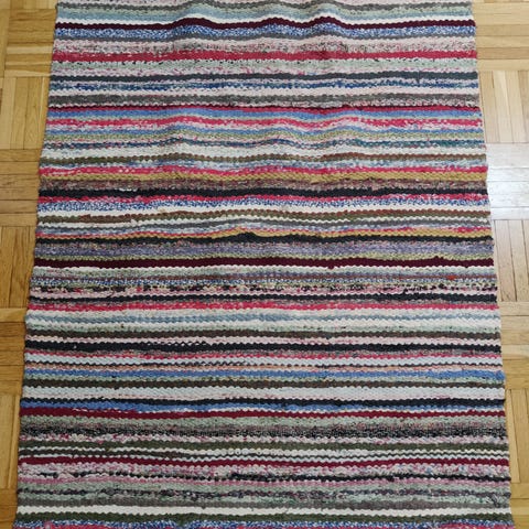 Monivärinen,käytetty ok kunto. Yhdessä kulmassa enemmän kulumaa/lankoja poikki.