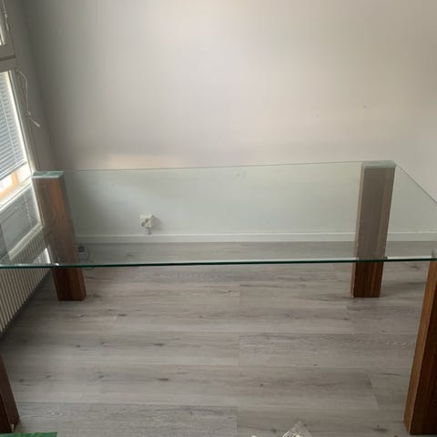Tyylikäs Ikea Glivarp malliston moderni ruokapöytä, jossa on lasinen pöytälevy ja metalliset jalat. Pöytä on laajennettavissa keskeltä mekanismilla, mikä tekee siitä käytännöllisen valinnan erilaisiin tilaisuuksiin ja tiloihin. Lasipinta tuo keveyttä ja avaruutta huoneeseen, kun taas metallirunko antaa sille tukevuutta ja kestävyyttä. Käytön jälkiä pöydässä ja lisäksi pintalikaa lasin ja rungon väleissä, joka voi vaatia puhdistusta.