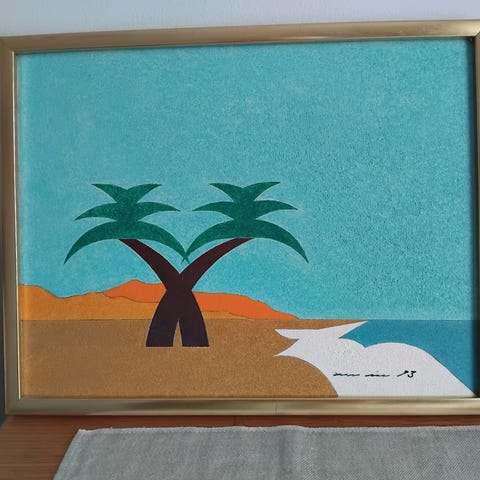 Kehyksissä on havaittavissa kulumista ja pieniä halkeamia. Maalaus itsessään on hyvässä kunnossa.