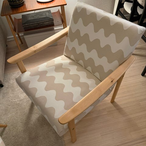Kaikki pehmusteet uusittu ja verhoiltu Marimekon Pirputparput -markiisikankaalla. Runko putsattu ja lakattu.