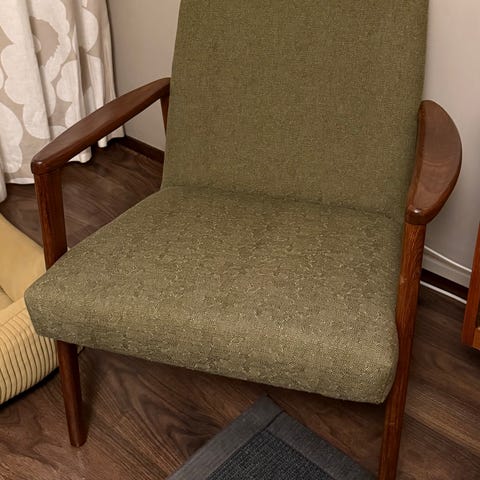 Myydään teak -runkoinen vanha entisöity nojatuoli.