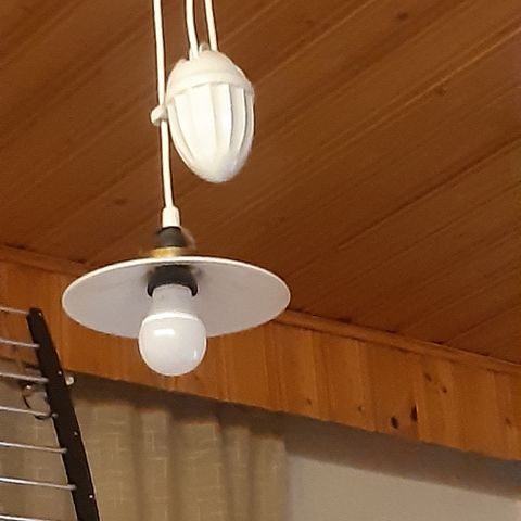 Lampussa on alkuperäinen nosto–laskumekanismi, messinkinen kupuosa ja valkoinen lasivarjostin.