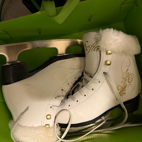 Säädettävät luistimet 26-29, helppo säätää koko napista painamalla ja vetämällä luistimen etuosaa. Terät hyvässä kunnossa. Toisen luistimen nauhoissa kulumaa, vaan ei vaikuta käyttöön. Helppo laittaa pienelle jalkaan.