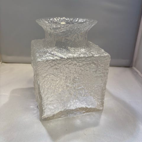 Timo Sarpanevan suunnittelema Iittalan Crocus lasimaljakko. Karkea pinta. Muuten hyvässä kunnossa, mutta ”suuosan” reunassa on karheutta sormella reunaa sivellessä ja joistain kohti pieniä paloja pois. Ei saa kunnolla kuvattua. Eivät haittaa käyttöä. Koko 10 x 10 cm, korkeus 15 cm.