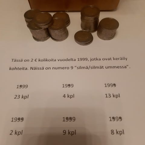 2 euron suomi kolikko vuodelta 1999 virhelyönnillä joka näkyy vuosiluvun ensimmäises yhdeksikössä. Tarjoa hintaa !