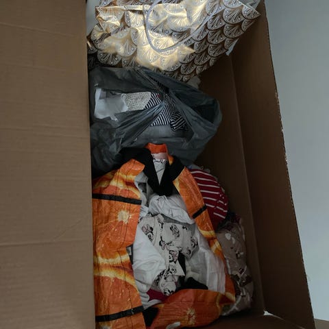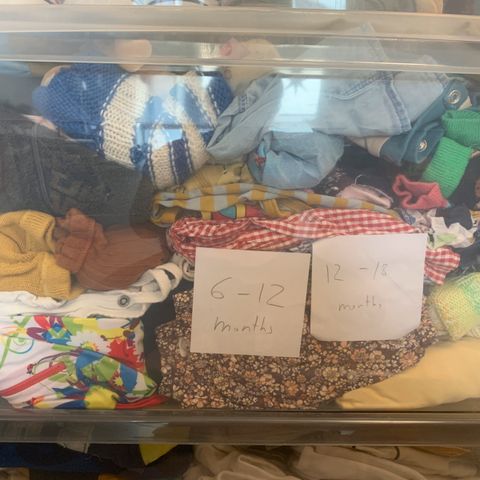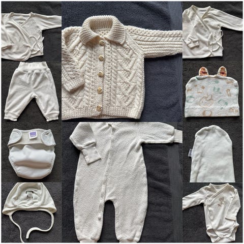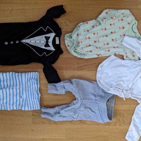 Pienten vauvojen vaatteita, sekä äitiyspakkauksessa tulleita.