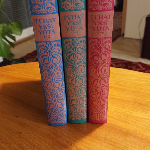 Myydään todella hienossa kunnossa oleva kirjasarja Tuhat yksi yötä, osat 1-2, 3-4 ja 5-6 pakettina. Paperissa kellastumaa, muuten erinomaisessa kunnossa. Ei omistuskirjoituksia.