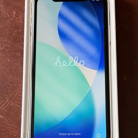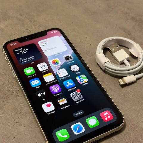Apple iPhone 11 älypuhelin, tallennustila 128 GB. Väri musta. myyntipakkaus, johdolliset nappikuulokkeet sekä suojakuori ja kaulahihna. Näytössä on etukameralovi ja takana kaksoiskamerajärjestelmä. Akun huippukapasiteetti on näytön perusteella 82 %.