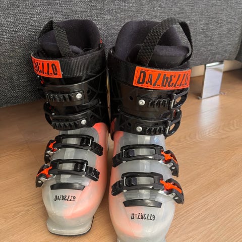 Dalbello lasten laskettelumonot, pohjan pituus 279 mm / 235mm. Suoraan käytöstä, ehjät, meille jäi pieniksi.