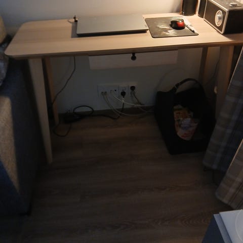 Ikea Lisabo työpöytä. Muuten siistikuntoinen, mutta yhdessä jalassa naarmuja. Jalan saa laitettua takajalaksi seinää vasten niin ettei naarmut häiritse.