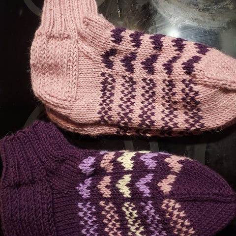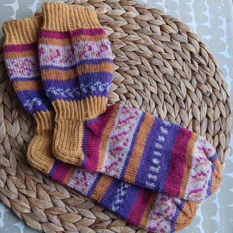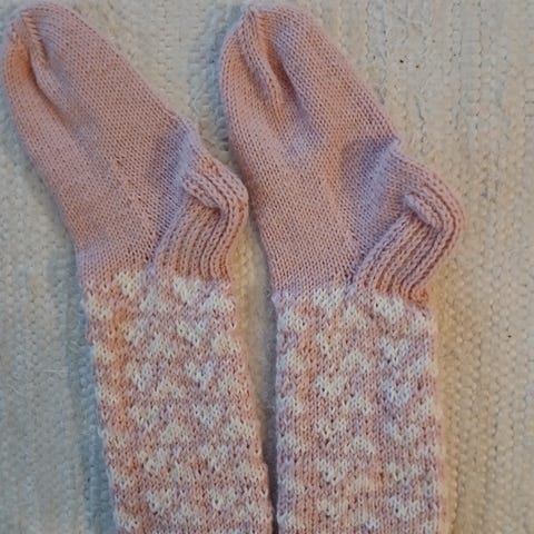 Uudet vaaleanpunaisen ja vadelmanpunaisen väriset villasukat joustavaa kokoa 38-39 villasekoitelangasta sydänkuvioin. 75% villaa, 25% polyamidia. Luonnossa värit ovat hieman tummemmat / syvemmät. Kestävät konepesun 40 asteessa. Vahvistettu kantapää. Pohjan pituus joustava 24,5cm. Varsi 12,5cm.