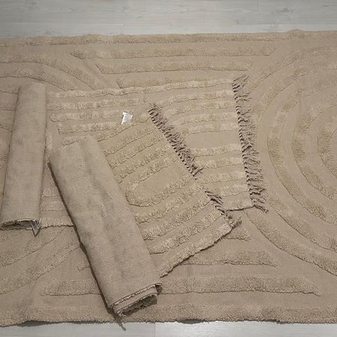 Myydään hyväkuntoinen neutraalin värinen puuvillamatto koko 151x220 cm.