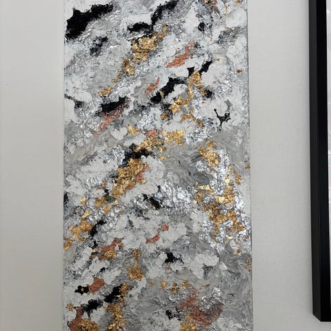 Abstrakti maalaus akryyliväreillä kankaalle. Teoksessa on musta pohja ja päällä roiske- ja viivamaisia kuvioita turkoosin, kullan, violetin ja valkoisen sävyissä. Maalaus sopii seinälle sisustuselementiksi esimerkiksi olohuoneeseen, makuuhuoneeseen tai työtilaan. Teos on yksittäiskappale, ja se on toteutettu paksulle kankaalle, joka on pingotettu kehyksiin ja valmis ripustettavaksi. Koko 80 x 60 cm.