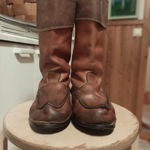 Kengät ovat vanhat ja niissä on pinnassa ajan patinaa. Nahkaa kannattaa hoitaa vahauksella. Muuten edelleen hyvässä kunnossa.