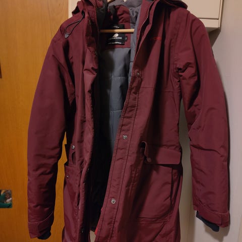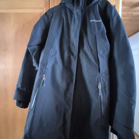 Didriksons naisten lämmin talvitakki, koko 40. Vihreä, polvipituinen malli, jossa kiinteä huppu.