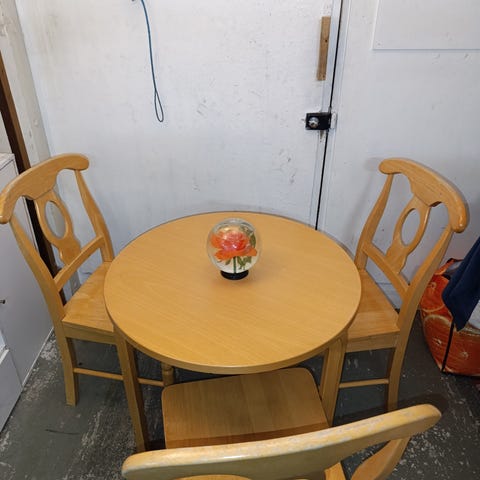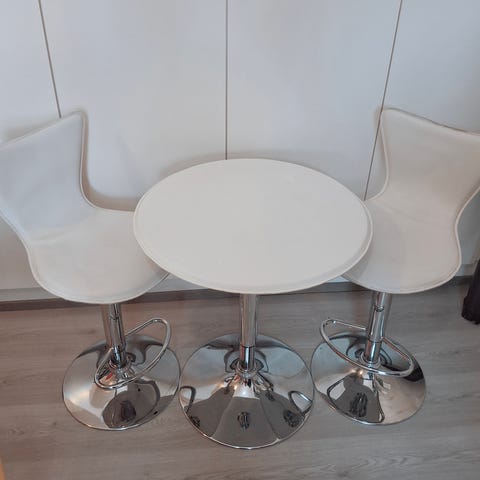 Hyvässä kunnossa oleva ruokapöytä ja neljä tuolia. Pöydän halkaisija 110 cm, korkeus 73 cm. Pöytä ja tuolit ovat tukevat.
