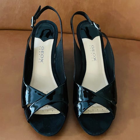 Geox korkokengät, koko 36. Väri musta, kiiltävä pinta. Kapeakärkinen malli korkealla korolla. Pohjassa Geox Respira -ilmanvaihtoaukot.
