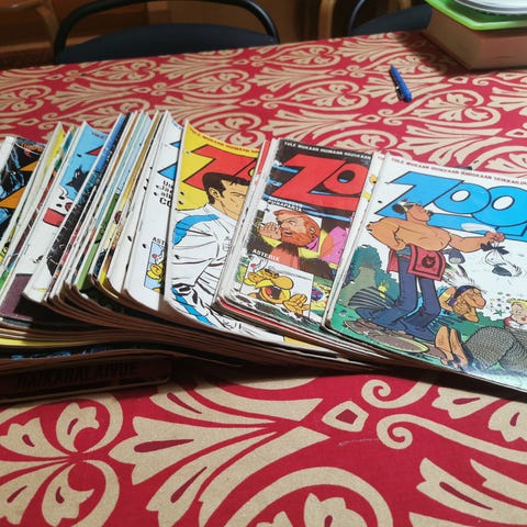 Sanoma Osakeyhtiön julkaisema Zoom-sarjakuvalehti ilmestyi lokakuusta 1973 joulukuuhun 1974. Tuona aikana uunista tuli ulos 59 numeroa, joukossa kaksi tuplanumeroa. Kuvien kasoissa ovat kaikki Zoomit tuolta ajalta poislukien numero 4/1974 - se on livahtanut omille teilleen. Lehdet ovat luettuja ja vain yhdellä omistajalla olleita. Kaikki kannet ja sivut tallella, ei siis puutteita, mutta kulumaa lehdistä löytyy. Myydään vain kaikki lehdet yhdessä. Kotiinkuljetus järjestyy samaan hintaan Tampereella ja naapurikunnissa, lähetyskulut lisätään. Kysäise!