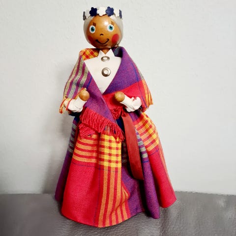 Puunukke koristehahmo, jonka korkeus on noin 10 cm. Nukella on punainen, valkopilkullinen puku ja esiliinassa monivärinen kukkakuvio. Päässä on punainen päähine ja kasvoihin on maalattu yksityiskohtaiset piirteet. Sopii koriste-esineeksi esimerkiksi hyllylle tai kokoelmaan.