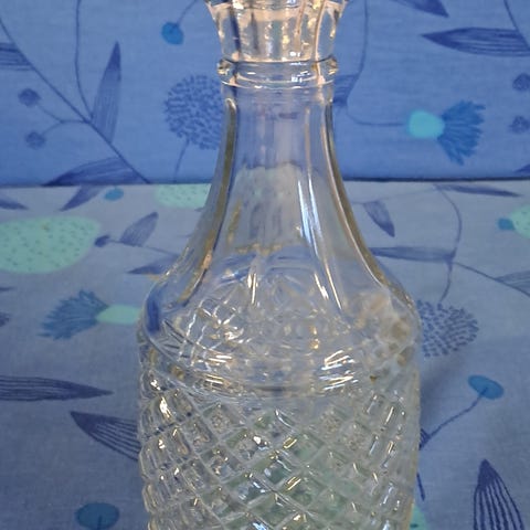 Korkillinen,pieni,lasikarahvipullo esim.öljylle tai etikalle ehjässä kunnossa. Korkeus 14 cm korkin kanssa. Katsothan myös muut ilmoitukseni.