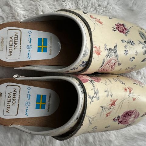 Uudenveroiset ja ihanat kukkakuvioiset Moheda Toffeln puukengät/hollannikkaat. Valmistettu Ruotsissa. Sisävuori nahkaa. Koko, reilu 37. Sisämitta 24 cm. Ovat sittenkin hieman liian pienet minulle ja siksi myyn pois. Kivat kengät kotiin, mökille, vaunuun.