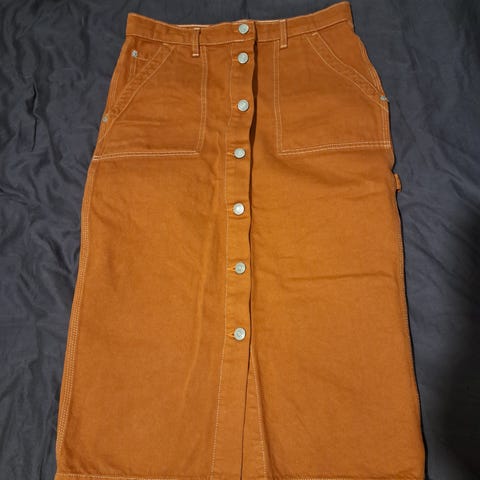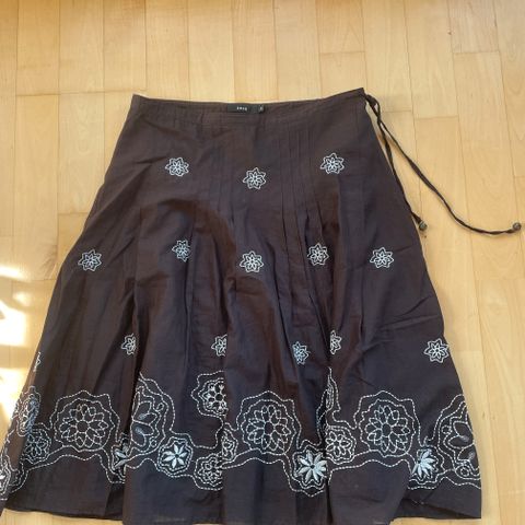 Kirjava pystyraidallinen hame jossa kiinteät vyönahat. Runsas röyhelöinen alahelma. Kietaisutyylisen näköinen malli. Takana vetoketju. Kiiltävä, sileä ja ohut materiaali.