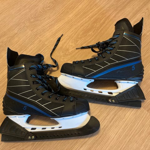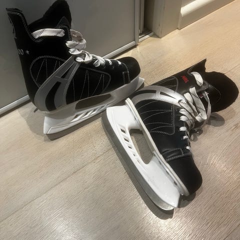 NHL 5000 jääkiekkoluistimet, koko 45. Väri musta valkoisilla ja harmailla yksityiskohdilla. Teräosa on valkoisessa teräkiskossa, nauhakiinnitys. Sopivat jääkiekkoon ja muuhun jäällä liikkumiseen. Hyvin vähän käytetty, ehkä parki tuntia. Ei koskaan teroitettu.