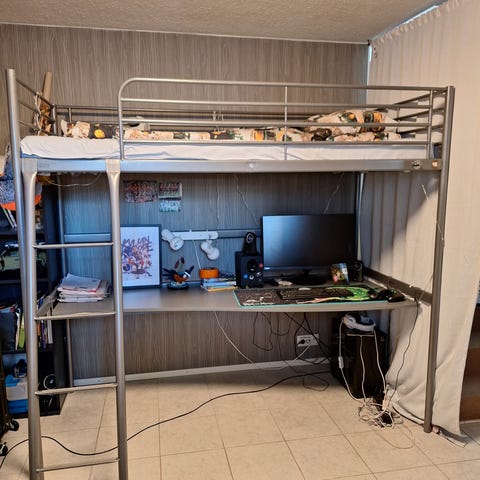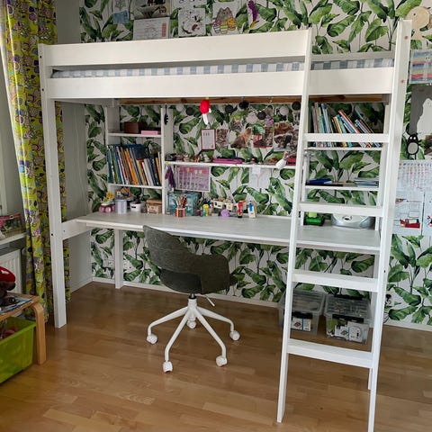 Hyvässäkunnossa oleva parvisänky seuraavalle käyttäjälle sillä meillä villitys meni jo ohi.. patjaa ei ole mukaan joten sen joutuu erikseen hommaamaan ja hieman on kynsilakkaa yhdessä laudassa mutta ei haittaa käyttöä milläänlailla. Tarjoa! Mitat: korkeus:107cm lattiasta, leveys:87cm ja pituus:208cm