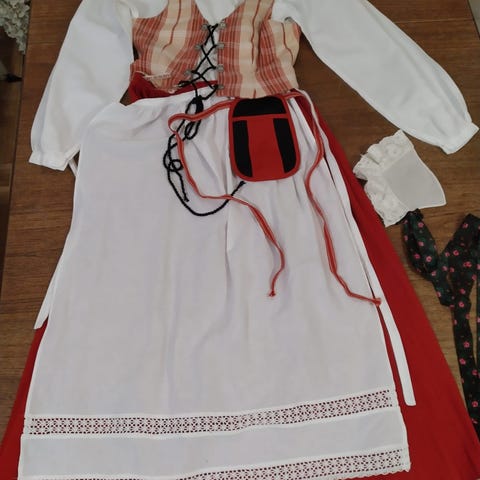 Esiliina lasten kokoa, pituus ylhäältä alas 62 cm. Erittäin haalea pieni tahra edessä. Pieni nyppy edessä. Hienot pitsit. Ostettu käytettynä, myydään käytön puutteessa eteenpäin.