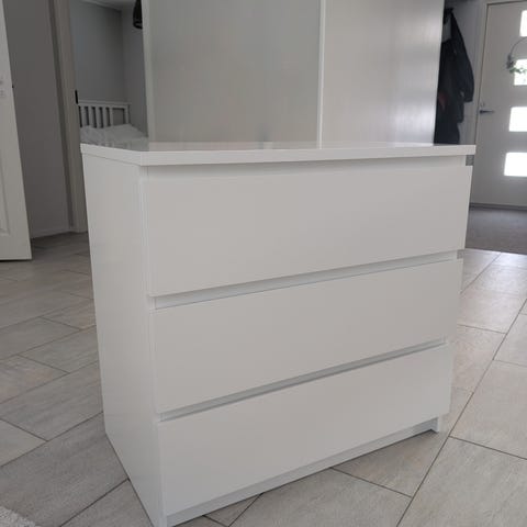 Hyväkuntoinen 3-laatikkoinen Ikean lipasto, kaikki laatikot toimii. Muita kauneusvirheitä ei ole, kuin oikeassa reunassa kupruama kaatuneesta vedestä. Melko huomaamaton jälki.