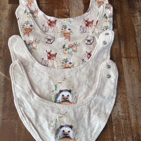 Enemmän tai vähemmän käytettyjä, mutta edelleen mielestäni oikein käyttökuntoisia kuolalappuja seuraavalle vauvalle/taaperolle. Osassa pientä tahraa, joka ei lähtenyt tavallisessa pesussa, mutta käyttöä eivät haittaa. Yleisilme kuitenkin ok.