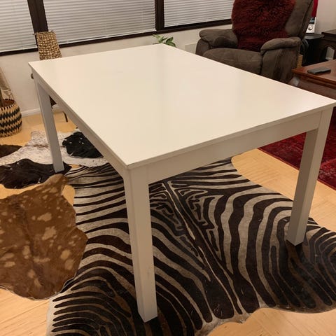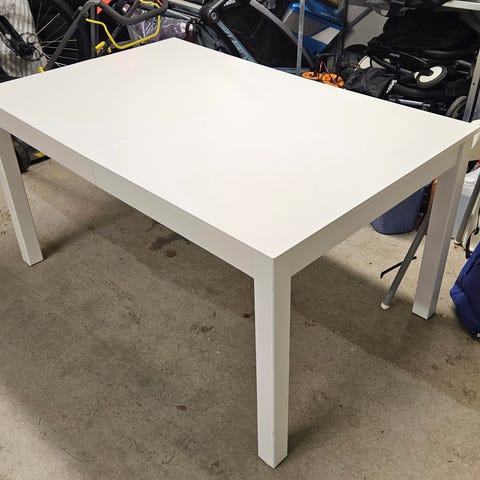 Musta, puinen jatkettava pöytä. Hyvässä kunnossa. Voidaan käyttää pienempänä suorakaiteen muotoisena pöytänä tai avata suuremmaksi lähes neliönmuotoiseksi pöydäksi. Soveltuu esimerkiksi ruokapöydäksi tai työpöydäksi. Myydään, koska meillä ei ole enää tarvetta. Mitat: 50cm x 90cm tai jatkettuna 88cm x 90cm. Korkeus noin 75cm.