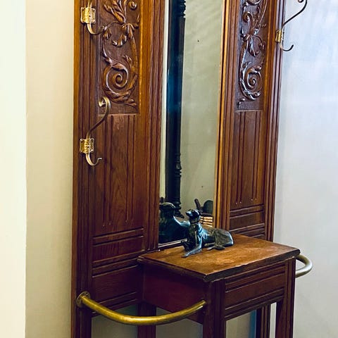 Myydään kaunis ja harvinainen antiikkinaulakko, jossa yhdistyvät laadukas puusepäntyö ja upeat metallikoristeet. Kyseessä on todennäköisesti myöhäis-1800‑luvun uusrenessanssi- tai varhais-arte nouveau -tyylinen seinänaulakko