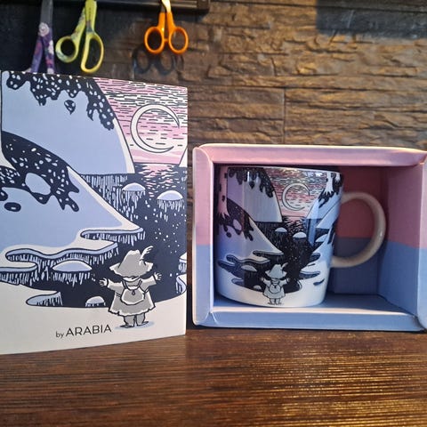 Muumimuki keräilyyn tai käyttöön. Laatikko ehjä ja siisti. Nouto, kulkeutuu myös lähistölle menojen mukaan.