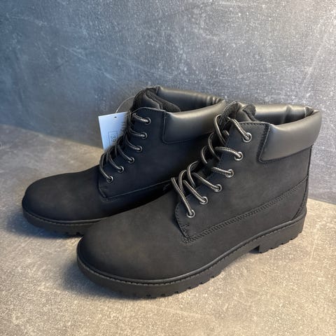 MyWear talvikengät, koko 37. Mustat nilkkapituiset talvikengät, joissa vaalea karvavuori varren suussa ja sisäpuolella. Nauhakiinnitys edessä sekä vetoketju sivussa pukemisen helpottamiseksi. Paksu, vaalea kumipohja ruskealla ulkopohjalla tarjoaa lisäkorkeutta ja pitoa talvikeleihin. Materiaali vaikuttaa olevan keinonahkaa. Sopivat arkeen kylmään säähän.