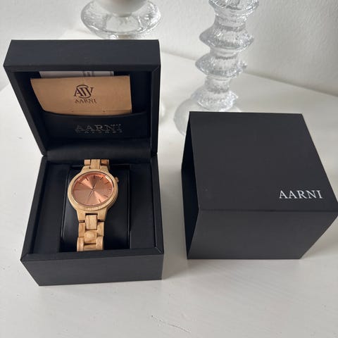 Aarni unisex-rannekello, jossa puinen ranneke ja metallinen lukko. Kellotaulu on vaalea ja pelkistetty, ilman numeroita. Kellon kehys on puuta ja runko metallia. Sopii käytettäväksi sekä arjessa että siistimmässä pukeutumisessa kaiken sukupuolisille käyttäjille.