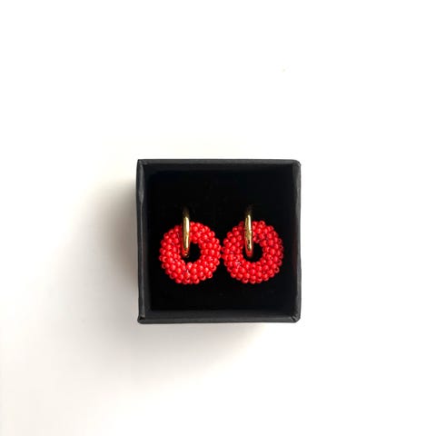 Vihreät lasihelmi-korvikset, allergisoimattomat kullansävyiset renkaat, korurasiassa. Pienet ja kevyet, donitsin läpimitta 2cm. Myös hopeisella allergisoimattomalla renkaalla ja helmidonitseja myös muissa väreissä✨