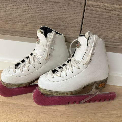 Riedell Topaz R12 lasten taitoluistimet, n 27,5. Ostettu käytettynä Lucky Skatesta. Kunto hyvä, teroitettu ostettaessa syksyllä, sen jälkeen luisteltu noin 1-2krt viikossa. Kengän pinnassa jälkiä käytöstä, naarmuja ja tussista väriä.