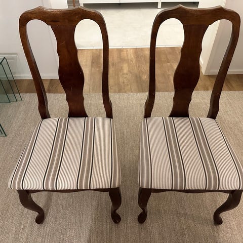 Näissä on istuttu ja usesmmat kahvit juotu eli kädensijat kuluneet. Istuimet ehjät (kangas&jouset). Yhden tuolin käsinojan liimaus irronnut (näkyy kuvissa).