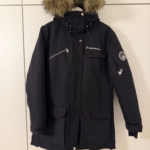 Naisten Peak Performancen parkatakki. Koko L. Siistikuntoinen ja muhkea. Muutamia pieniä tummentumia, ei ole koitettu poistaa.
