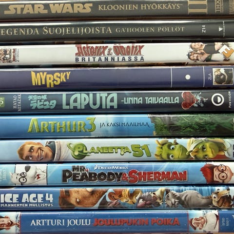 Myydään 10 kpl lasten DVD-elokuvia. Hinta on yhteishinta.
