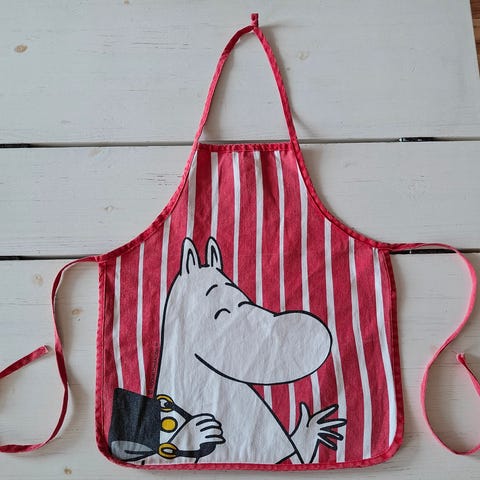 Lasten Muumiessu seuraavalle pienelle kokille. Suojaa vaatteita myös askarrellessa tai maalatessa. Luutulla voi pyyhkiä essun pinnan.