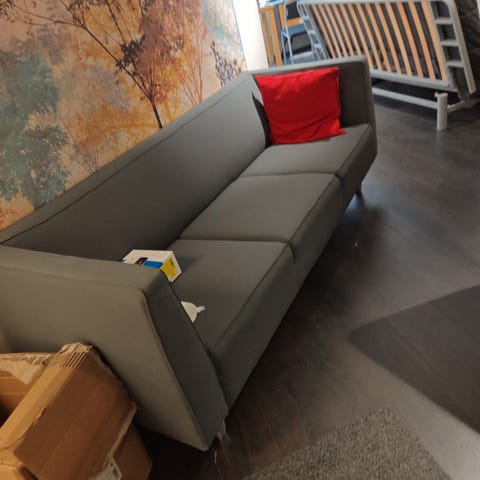 IKEA sohva, mitat noin 177 cm leveys ja 88 cm syvyys. Verhoilu vaaleansininen kangas. Suorat käsinojat ja selkeälinjainen muotoilu. Sopii olohuoneeseen tai muuhun oleskelutilaan istuma- ja lepotilaksi. Ollut erittäin vähällä käytöllä toimistolla. Tyynyt saa mukaan.